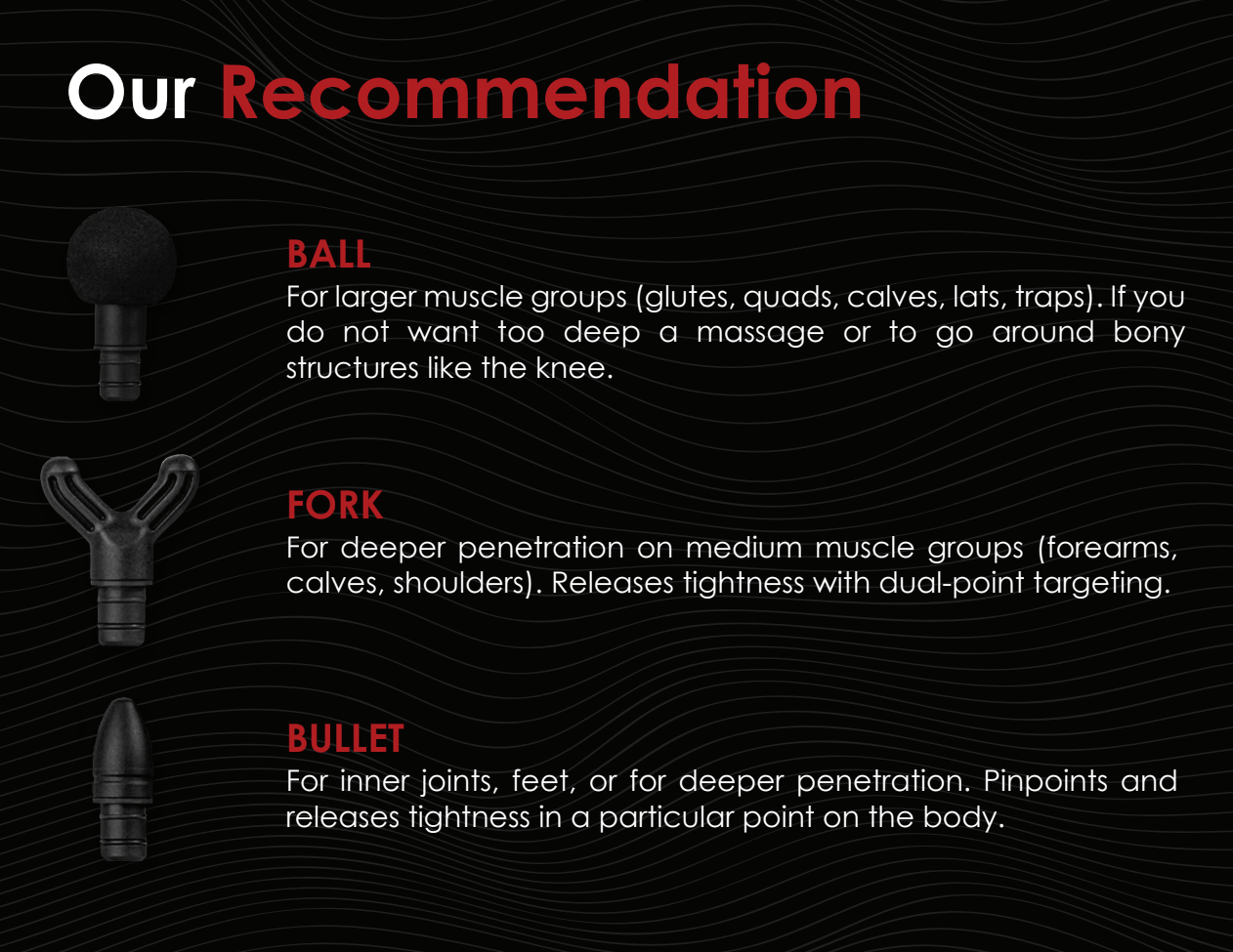 The general rule of thumb with attachment heads is to choose what most closely matches the muscle(s) you’re massaging. But you can also use the bullet and forkhead ones on larger muscles if they’re experiencing muscle knots. Another way you can vary your massage is by adjusting the speed settings and leaning into it for more pressure.