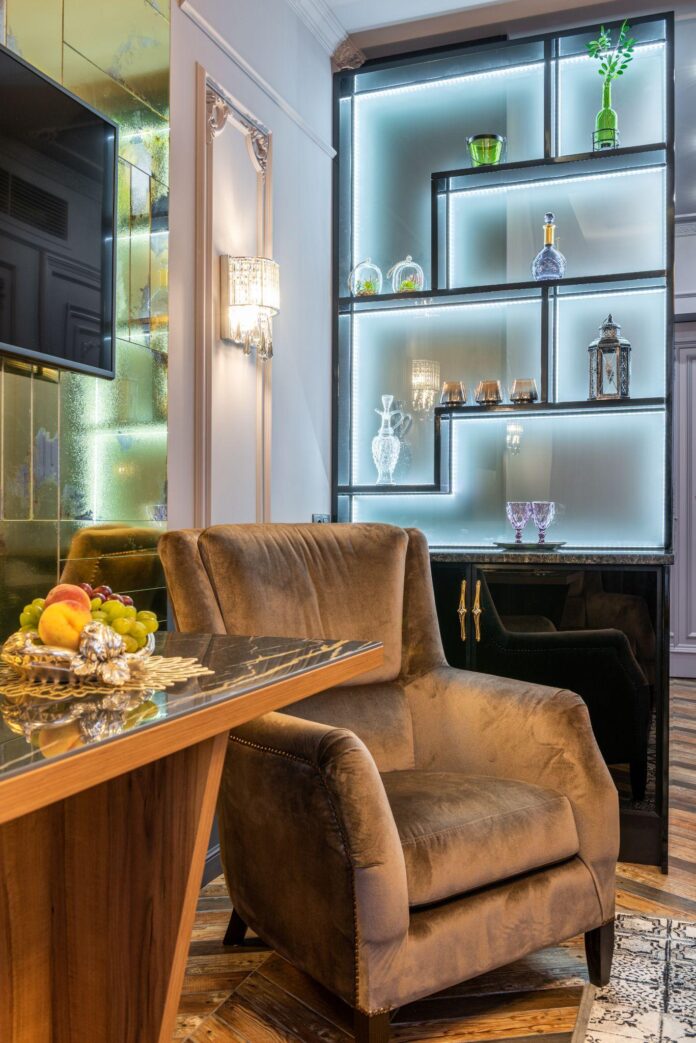 Using tempered glass shelves, you can use LED lights to add even more drama. It’s chic and sophisticated, perfect for modern designs.