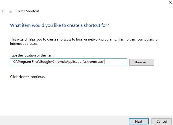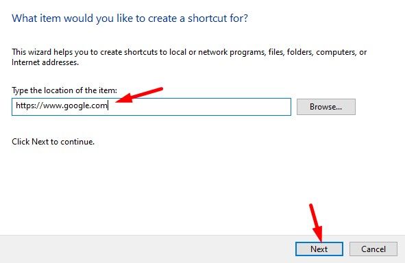 Step 6: Paste the installation path of your app here > name the shortcut > click on Next.