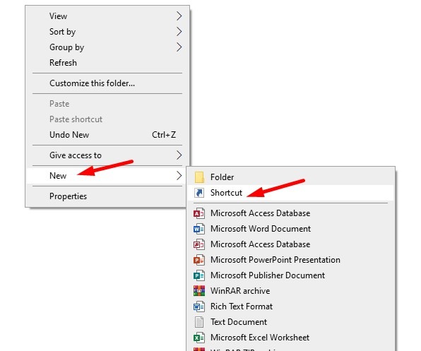Step 3: Now right-click in the blank area and choose new > shortcut.