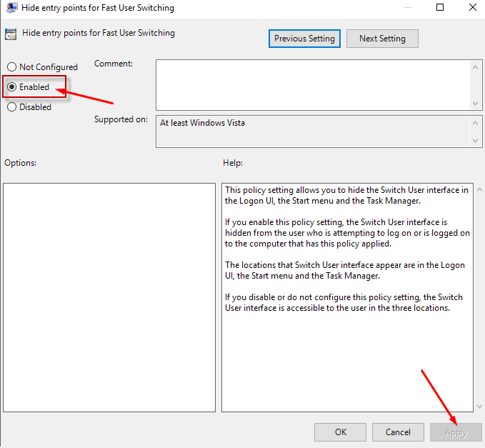 After that, you have to select Enabled to disable Fast User Switching.