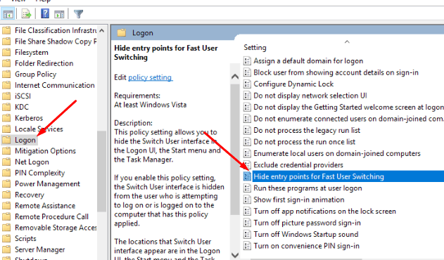 Disable Fast User Switching in Windows 10
