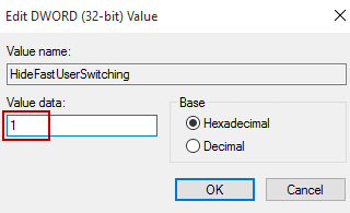 If it is not available there, then right-click on system on left side > new > Dword (32-bit) Value > Name it to HideFastUserSwitching. Now double-click on it and set the value to 1.