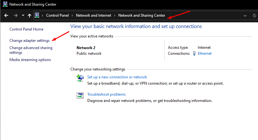 Step 2 – Go to Network and Sharing Center and then click on adapter settings from the left pane.