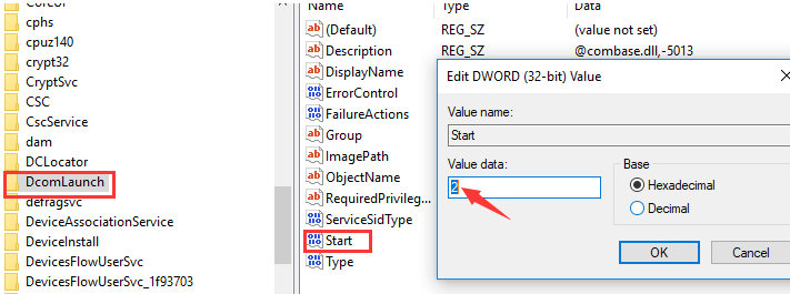 Step 5:- Now again go to, HKEY_LOCAL_MACHINE\SYSTEM\CurrentControlSet\services\DcomLaunch. And check if any file is missing. If you found DCOM Server Process Launcher not set correctly then double click on Start and then set its value 2.