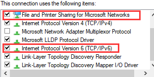 Step 3:- Check these the boxes of these files are ticked:- File and Printer Sharing for Microsoft Networks and Internet Protocol Version 6 (TCP/IPv6) are enabled.