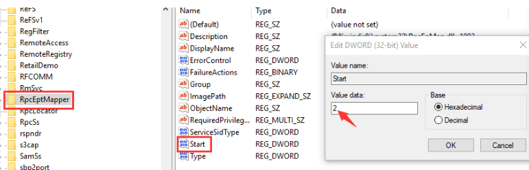 Step 4:- If in Method 1 you found that your RPC is not correctly set then you can edit the Start registry key in RpcSs path. Double click on the Start button and set its value 2.