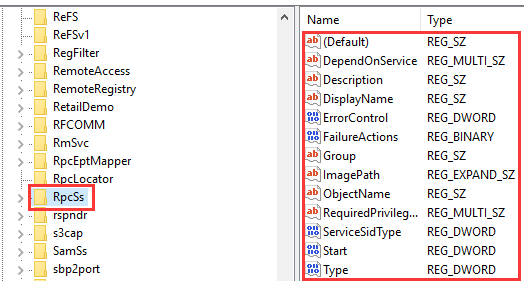 Step 3:- Now go to HKEY_LOCAL_MACHINE\SYSTEM\CurrentControlSet\services\RpcSs and check any item is missing from the below image. If it is then reinstall your windows.