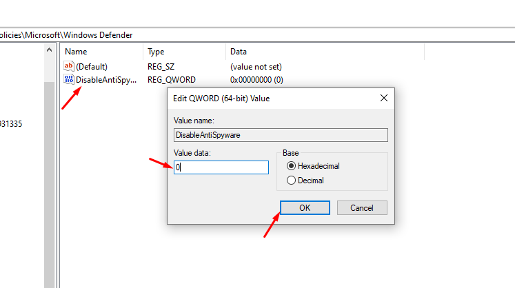 Step 3: You can see two values in the Windows defender folder. Right-click on the DisableAntiSpyware > Choose Modify > change the value from “1” to “0” > click on ok.