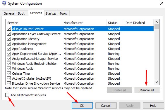 Step 2: Go to the Services > Hide all Microsoft services > click Disable all button.