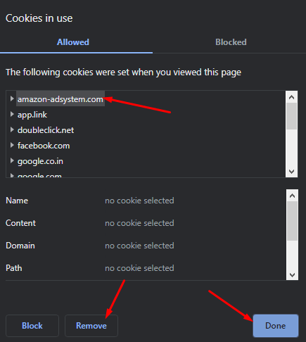 Step 3: Now remove all cookies and then click on done. Then Restart your browser.