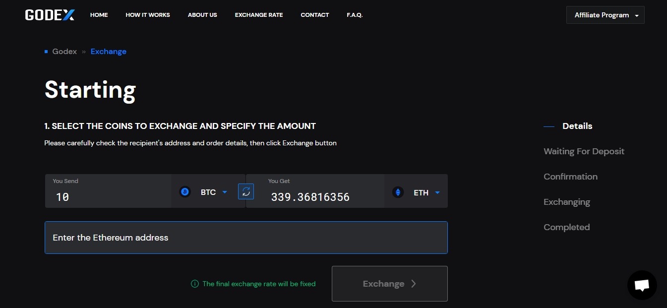 - Select the currency you’re sending (BTC) and the one you’re getting (XMR).