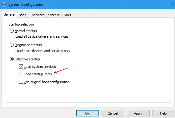 3) From the various System Configuration tabs, under the tab called General, make sure the option called Load startup items is unchecked.