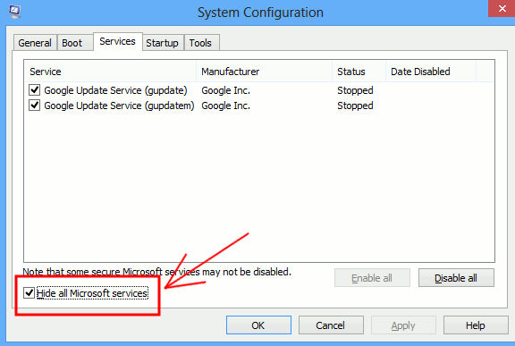 4) Now under the Services tab, check the Hide all Microsoft services box, and then click on the Disable all button.