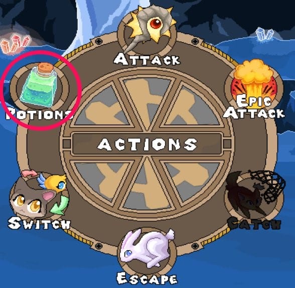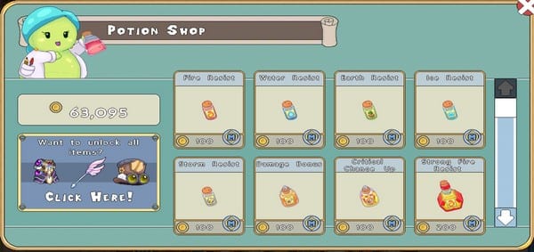 Potions are spells that you can only buy with the premium mode, and they give you an advantage in every battle. These items can be bought using your coins when visiting the Scientist Slimerella in Lamplight Town. Once you buy a potion, it will be in your backpack.