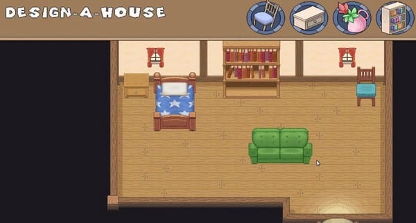 Every item comes in a category, and you can select these items from the Design-a-house menu. Items are dragged and dropped into place.