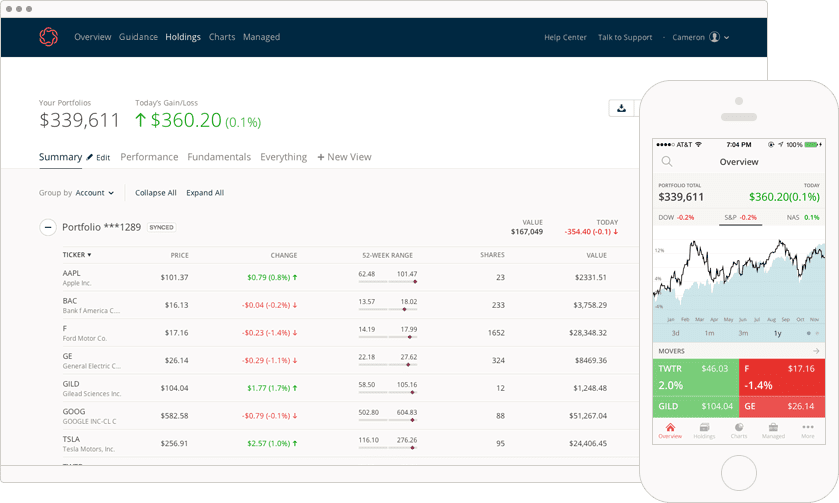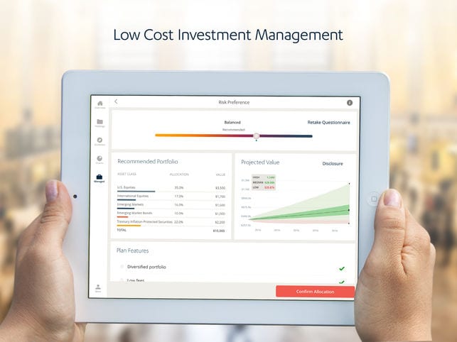 Their app enables users to track their brokerage held, financial investment portfolio in one location. They can also sign up to receive custom recommendations on how to achieve optimal performance based on information gathered (risk tolerance, income, invested assets, and age) during the sign-up process.