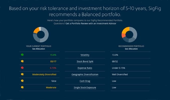 Unlike traditional robo advisors, you do not invest directly with SigFig. Their goal is to provide you with information that helps you manage your existing investments in your brokerage account. For example, they tell you which investments are underperforming or have high fees and also suggest alternatives.