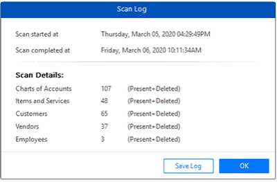 After selecting the file to be repaired, click Scan to initiate the scanning process. Once the scanning is complete, a dialog box opens with scan details. You can save the scan log and continue with the QuickBooks file repair process by clicking the OK button.