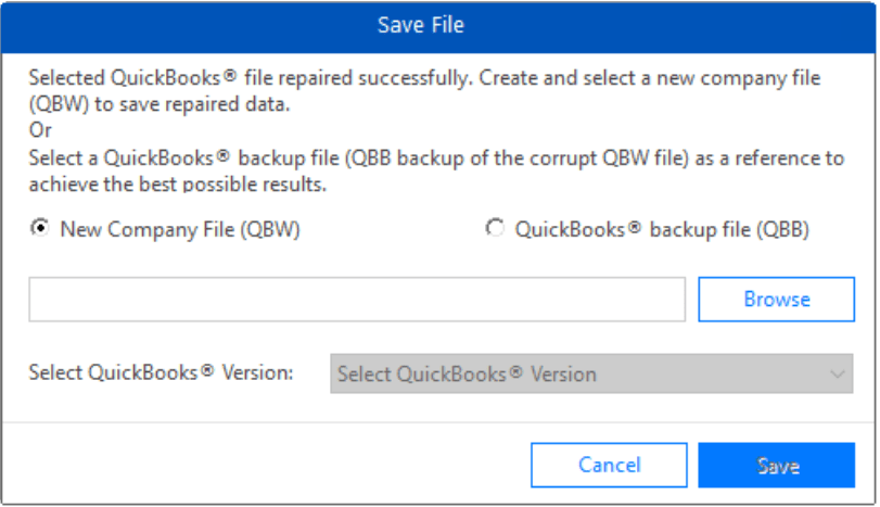 In the Save File dialog box, select the New Company File (QBW) option to create a new company file that will contain the repaired file data. If you have a QuickBooks® backup file, choose the QuickBooks® backup file (QBB) option to recover complete data from the corrupted QBW file. After selecting an appropriate option, click Save to proceed with the repair process.