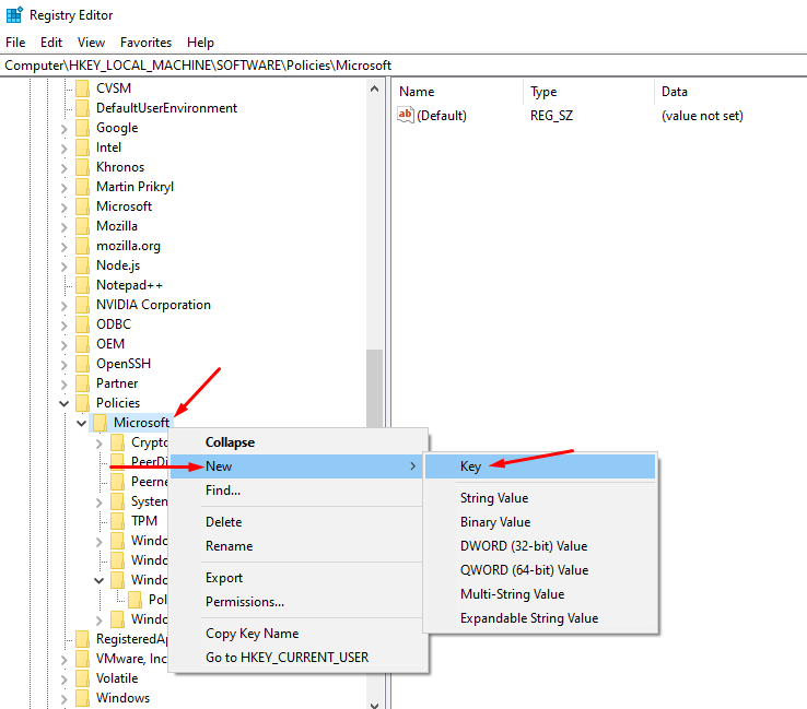 3) If you can’t find the PushToInstall key, create a new one. Right-click on the Microsoft key > new > key > name it to PushToInstall.