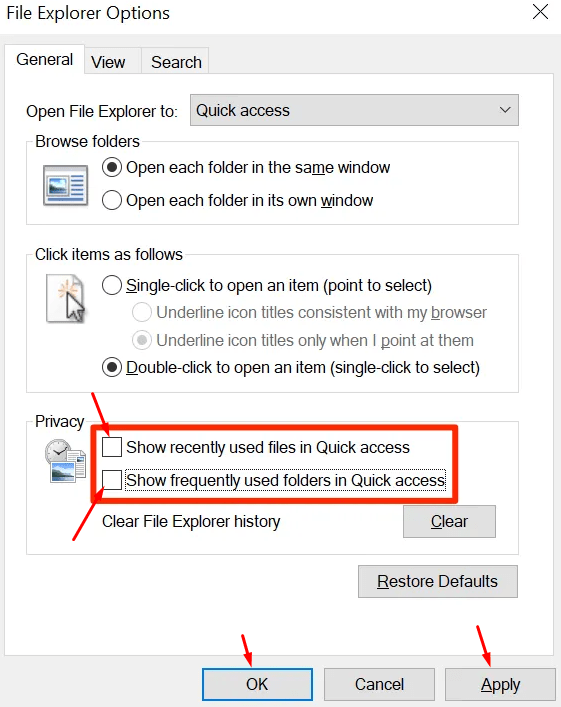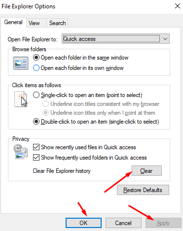 2. Open File Explorer Options > click on the clear button to clear all history. Then click on Apply > OK to save changes.